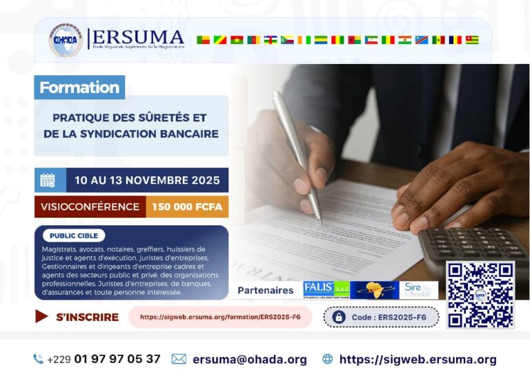 FORMATION ERSUMA : PRATIQUE DES SURETES ET DE LA SYNDICATION BANCAIRE DATE : du 10 au 13 Novembre 2025 VISIOCONFERENCE : 150.000 FCFA